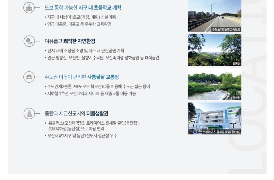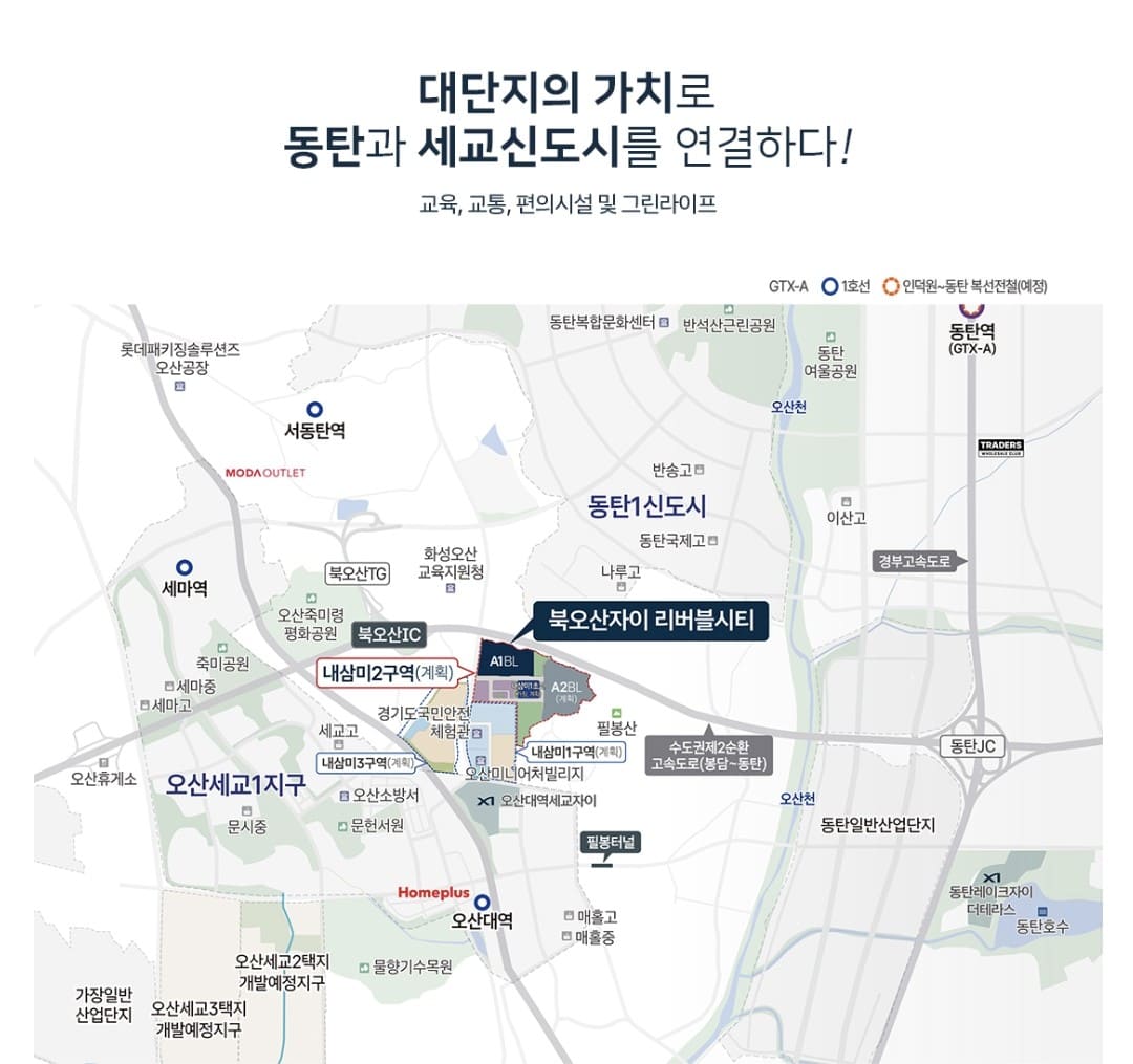 압도적 교통망: 북오산 IC와 인접하여 경부고속도로, 수도권 제2순환고속도로 진입이 매우 용이합니다.